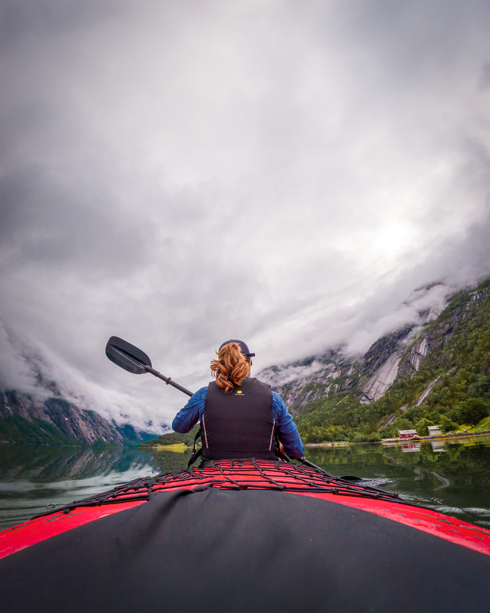 Upon arrival to Eidjord, we met our Kayaking tour guide at the Coop Supermarket parking lot. Here, we walked over to the shoreline where our equipment was waiting for us in an authentic Norway fishing cabin. After a brief safety lesson, we set off on two-person kayaks. Since we arrived on a non-cruise ship day, we were the ones in the group.