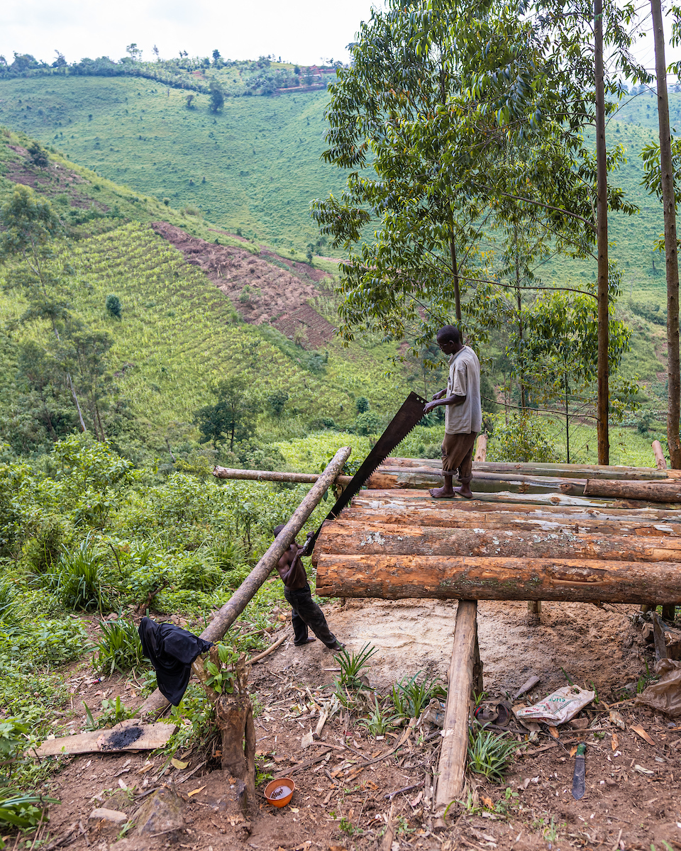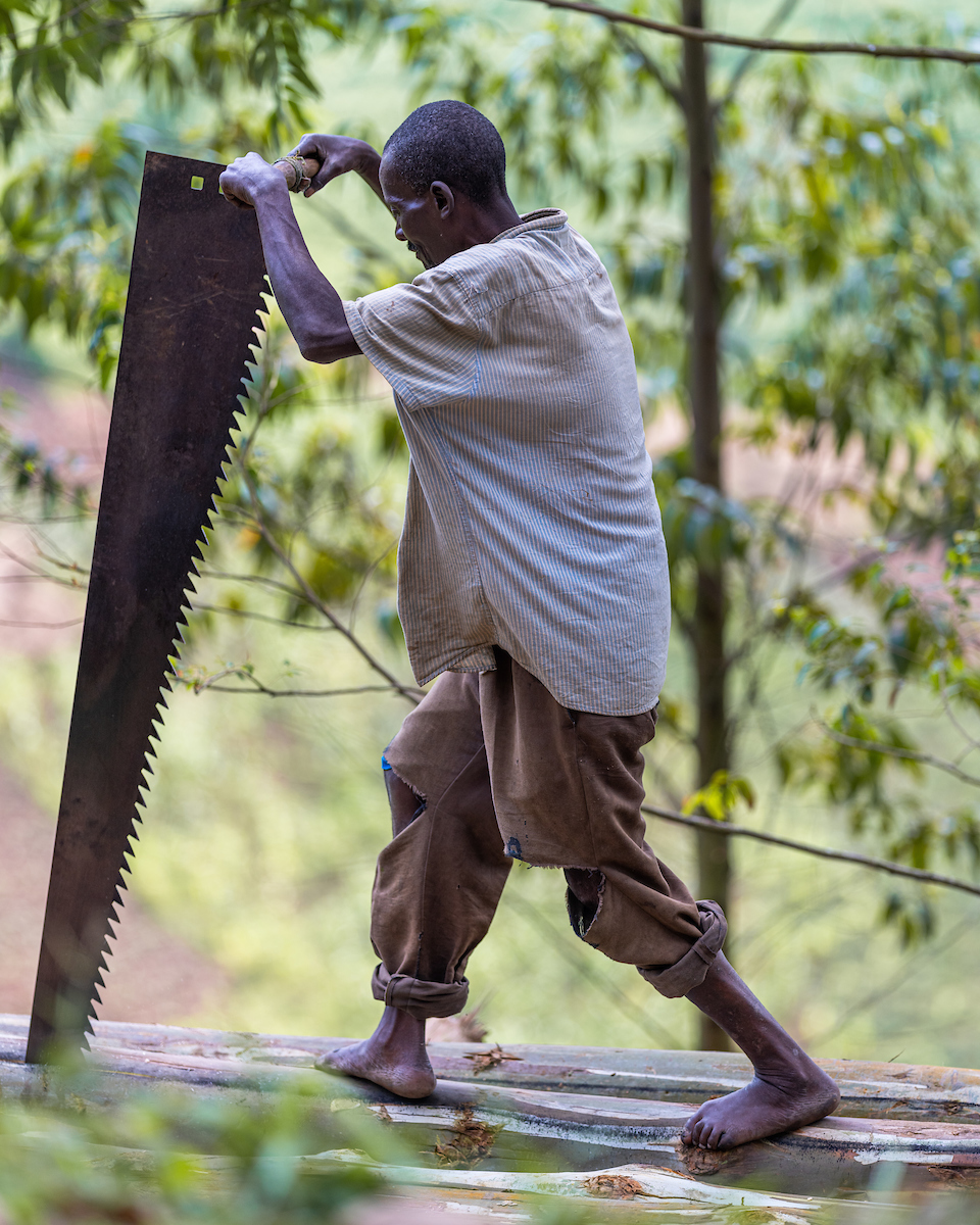 Hike back. As we headed back up the mountain-side and into community area again, we came across two workers that were making lumber by hand. The lumber is then sold to a "middle-man," before being sold to building contractors and others buying them at retail.